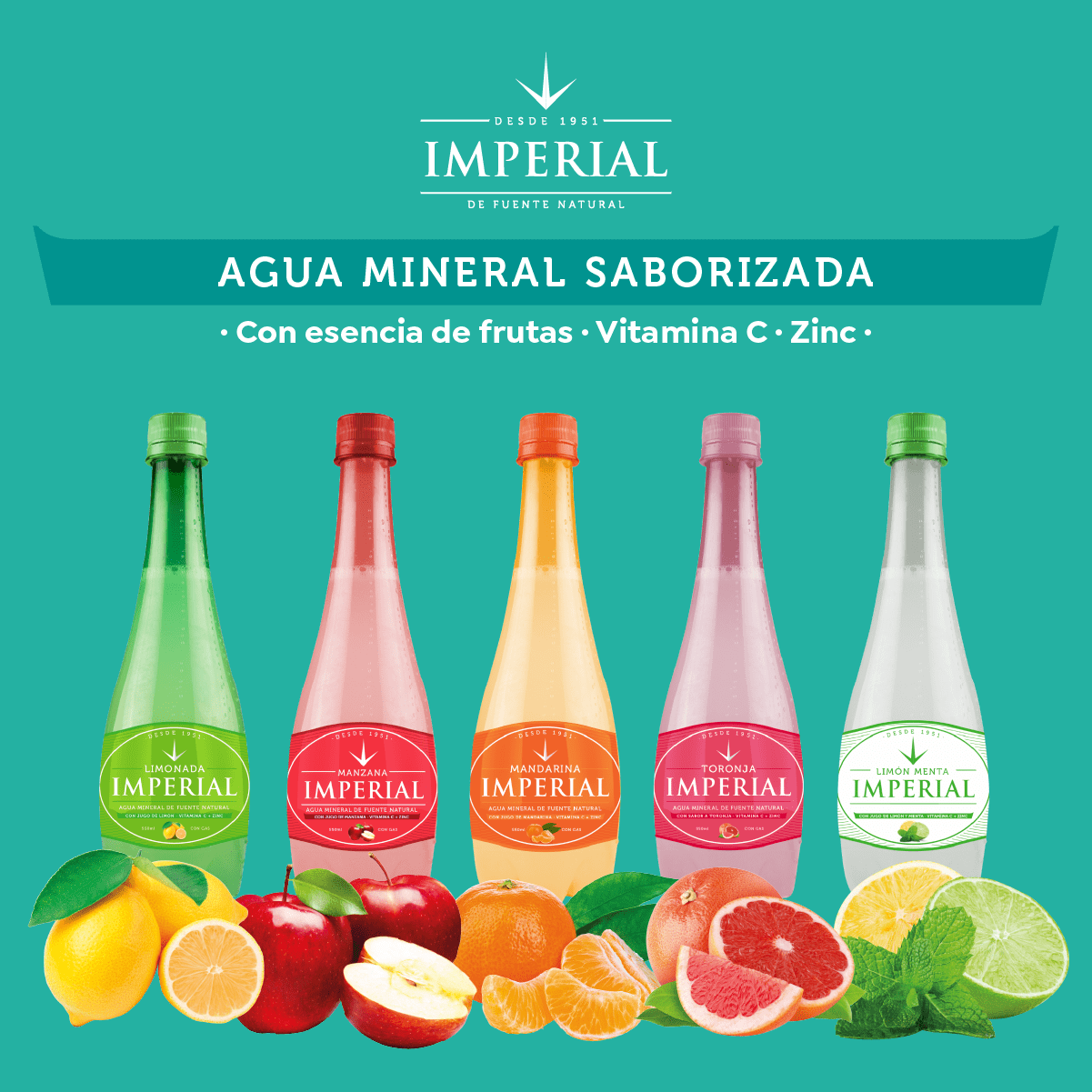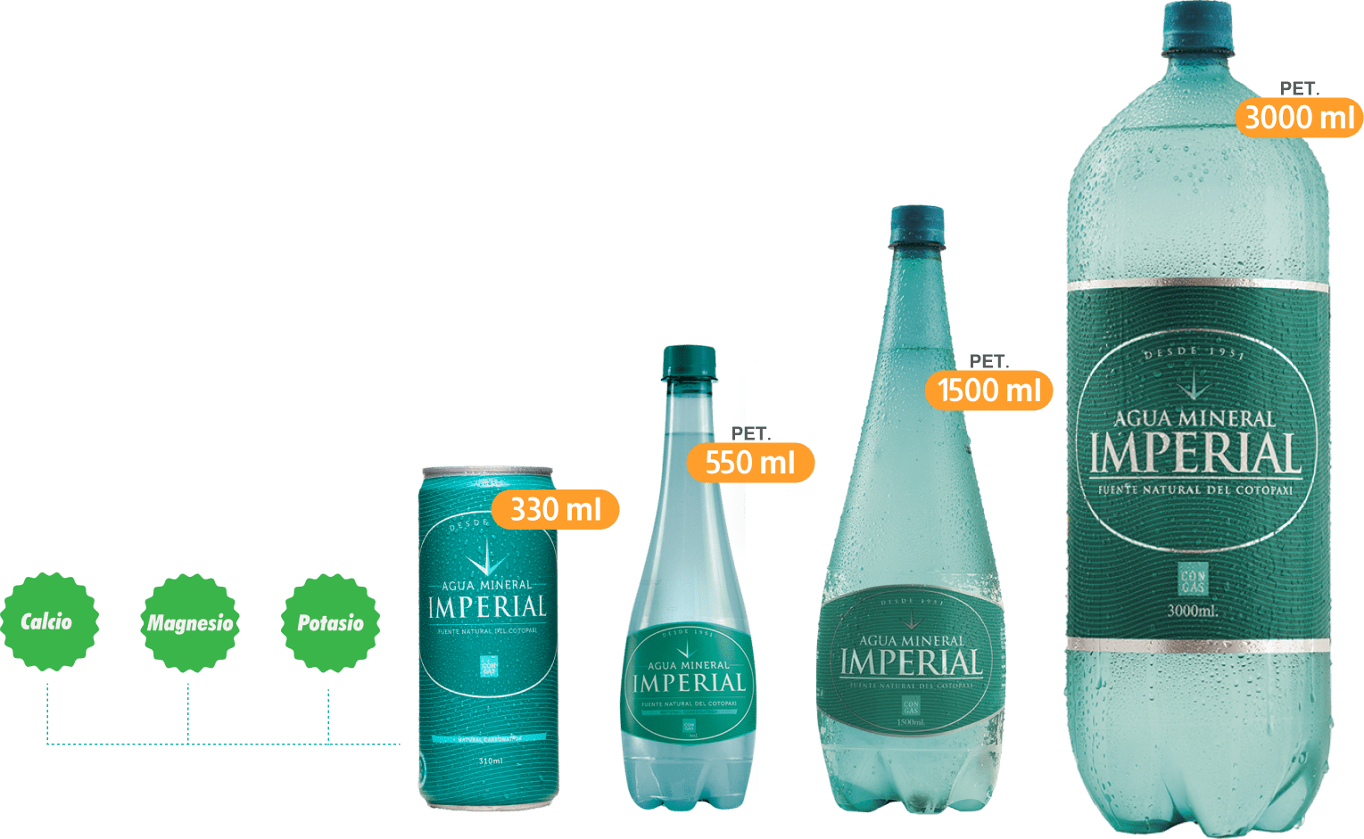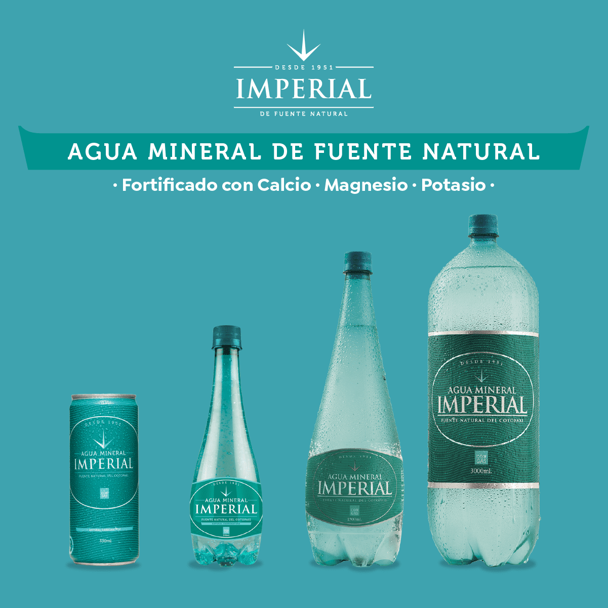 Agua mineral con gas, proviene directamente de una vertiente del volcán Cotopaxi en el corazón de los Andes. Imperial está compuesta de minerales naturales tales como calcio, potasio, magnesio que, junto a la sensación burbujeante, hacen de ella única en el paladar.